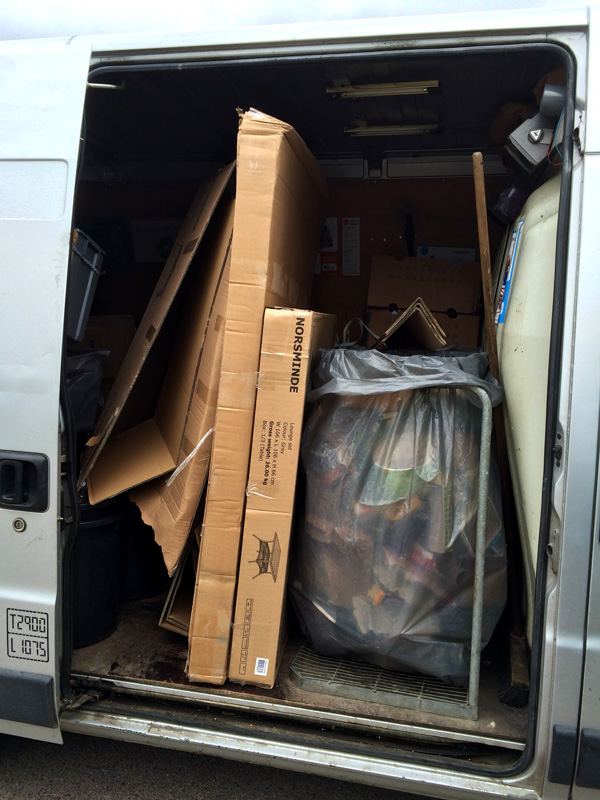 Vår kära buss har en oanad uppsugningsförmåga. Ibland är det svårt att förstå hur mycket återvinning man kan pressa in i skåpet. Men det har hänt att jag har kommit till en kund och tvivlat på att bussen ska räcka till. Då handlar det oftast om svårvikta kartonger. Vi har en kärra att ta till, men det är ju lite fusk? I år har jag råkat ut för stora möbelkartonger två gånger. Bussen var rätt full redan innan. Jag tvivlade. Men skam den som ger sig. Allt går med lite muskelkraft och envishet. Än har jag inte blivit besegrad av stora kartonger. Och jag tänker inte bli det heller. Så det så.