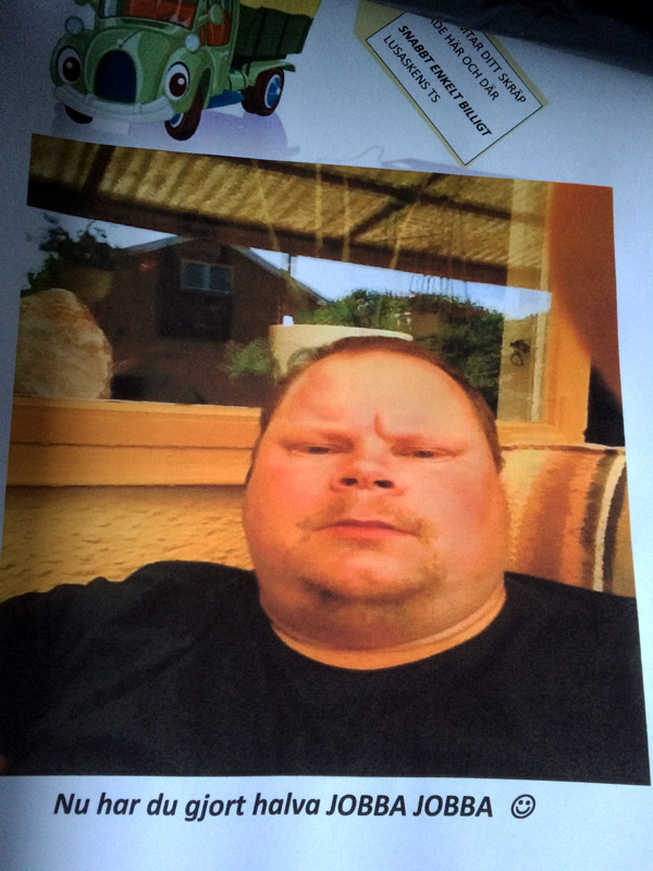 Vid förra årsskiftet fick vi ändra alla turlistor eftersom veckorna skiftade plats. Chefen Kim slet i mellandagarna för att jag skulle ha alla lappar i ordning den första veckan i januari. Han gjorde en praktfull insats. Som grädde på moset la han in några extrasidor här och där för att sprida extra glädje på turen. Den här bilden mötte mig när jag kört halva turen i Kil. Behöver jag säga att jag skrattade en lååång stund? Han är för söt min lillebror…