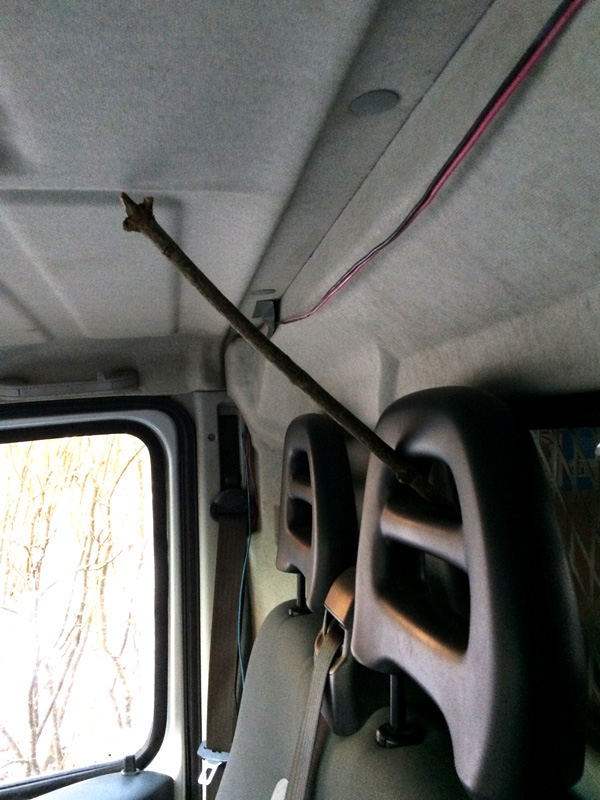 En dag när jag klev in i vår återvinningsbuss upptäckte jag att det satt en pinne från nackstödet till taket. Förundrad skickade jag ett sms till chefen med den här bilden och ett enda ord: Why???