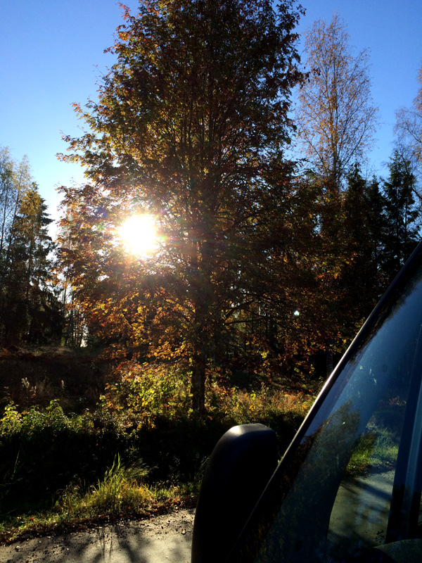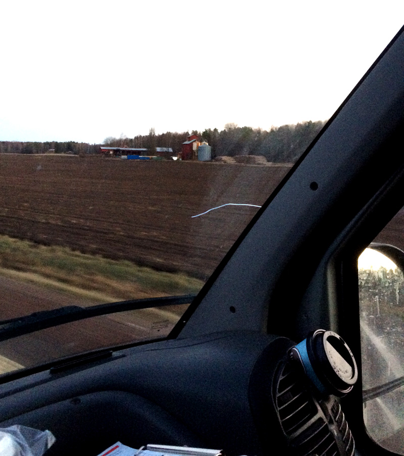 Det är svårt att undvika stenskott när man är ute på vägarna hela tiden. Eftersom vi hade flera prickar på vindrutan bestämde Kim att vi skulle byta den i somras. Så nu har vi en jättefin och hel ruta. Eller hade. I måndags såg jag en konstig linje i hörnet vid passagerarsidan. Det såg ut som en vit mask. Jag stannade för att undersöka saken. Ingen mask. En spricka på väg att bana sig fram mitt i synfältet. Nej! (Nu hoppas vi att det duktiga folket på MK Rekond kan hjälpa oss att stoppa sprickan.)